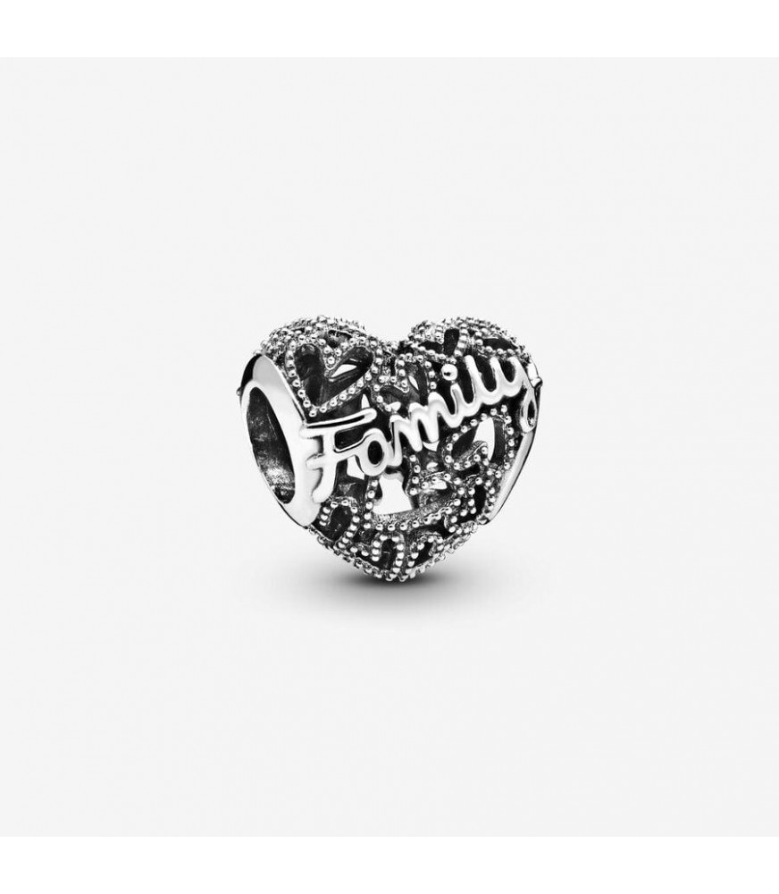 Quer esteja perto ou longe, a sua família está sempre no seu coração. Mostre o quanto a sua família significa para si, com esta conta especial em forma de coração com corações rendilhados e uma inscrição adorável: "Family".