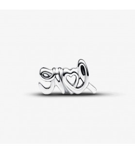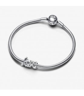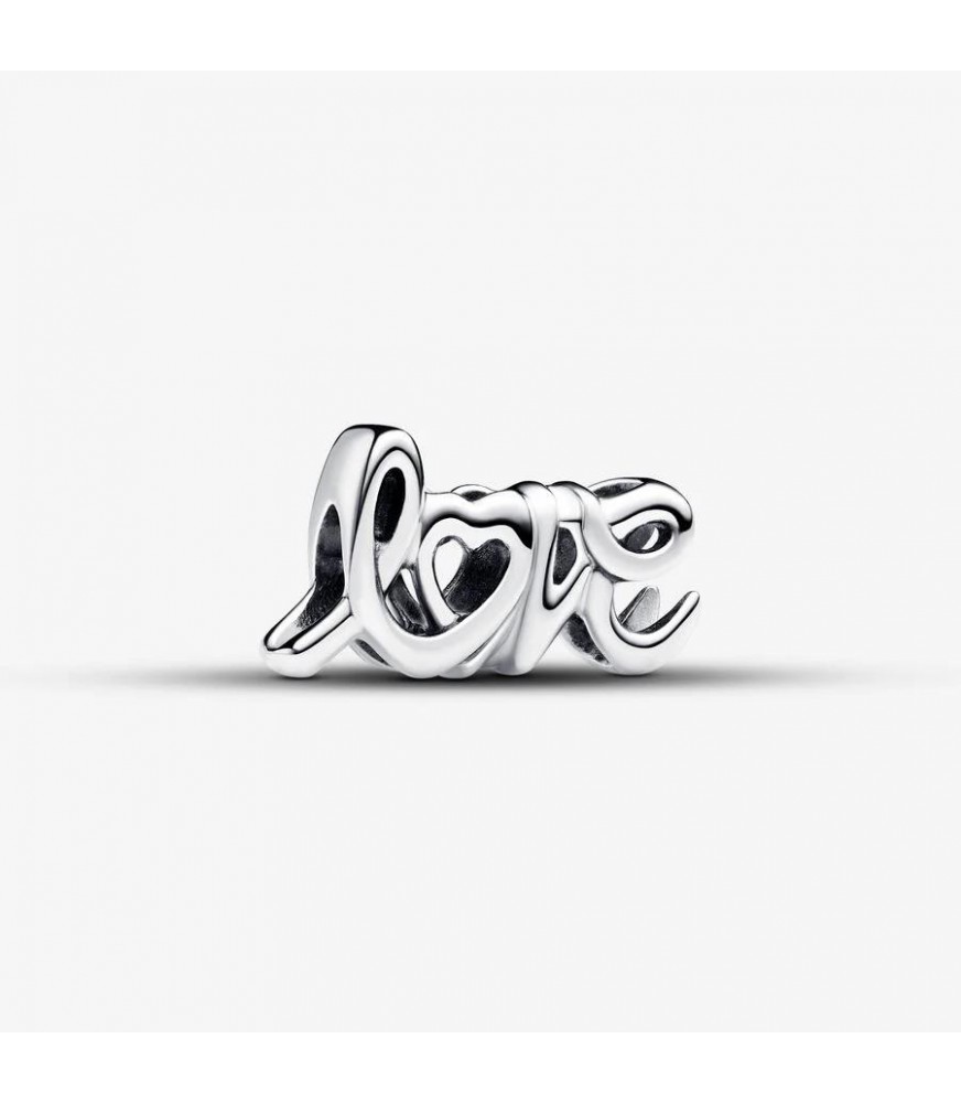Esta conta rendilhada de prata tem a forma da palavra "amor" em estilo manuscrito, desenhada para seguir a linha da sua pulseira ou suporte de contas.