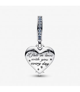 Atrás das estrelas, o efeito rodopiante da galáxia aparece na parte de trás do pendente, criado com esmalte brilhante em diferentes tons de azul. O verso da parte esmaltada está gravado com a mensagem "I fall in love with you every day".