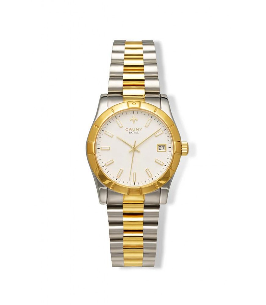 Com a Flor-de-Lis da Cauny embutida no mostrador, índices com o interior em madrepérola, pulseira em aço e proporções moderadas, o Cauny Royal é o acessório perfeito da mulher moderna. Esta versão combina um mostrador branco com uma bracelete e caixa bicolor, oferecendo um pouco de flair a um relógio clássico.