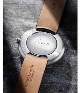 Projetado com base nas maçãs verdes que o Pritzker de 1995 costuma colocar do lado de fora de seus prédios, este relógio simboliza a juventude. Esta versão cinza, com caixa e mostrador em aço escovado, homenageia a maestria de Ando no concreto.