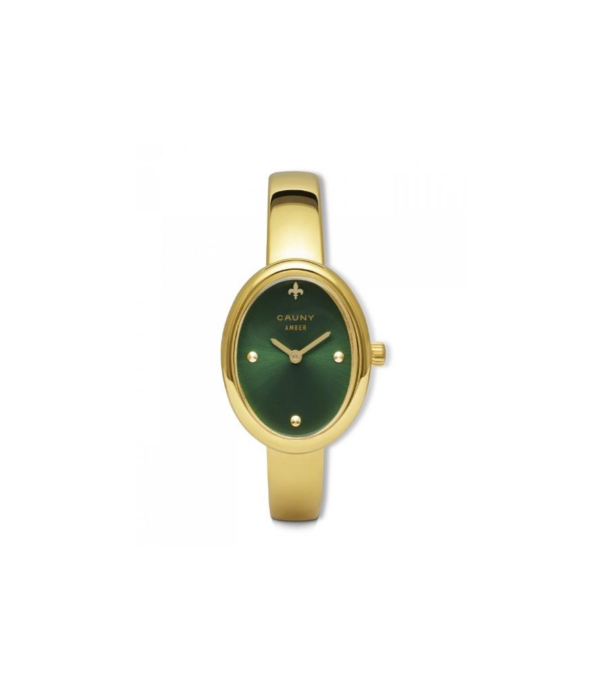 Concebido como um relógio-jóia, o Cauny Amber combina a elegância feminina com uma estética minimalista e contemporânea. O mostrador verde confere um toque de frescura e luxo, enriquecendo a bracelete dourada e a caixa oval com um tom vibrante e requintado.